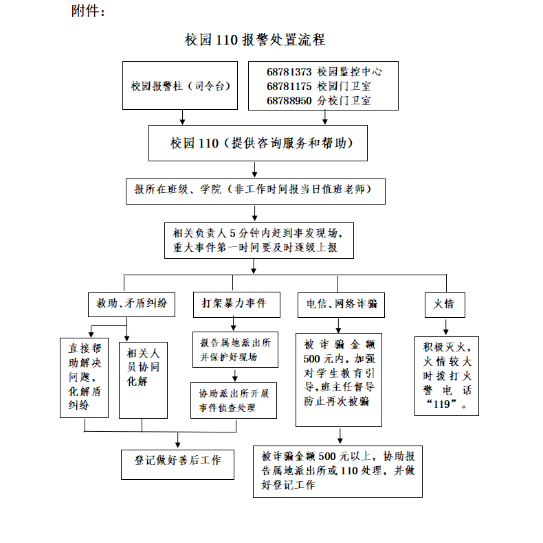 为加强校园管理,根据“学生有警必接,有难必帮,有险必救,有求必应”的原则,结合值班老师工作职能及学校实际制定“校园110报警”处置流程。