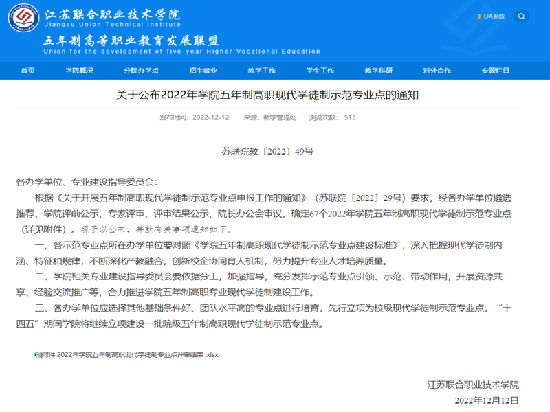 近日,根据江苏联合职业技术学院《关于公布2022年学院五年制高职现代学徒制示范专业点的通知》(苏联院教〔202249号)的文件精神,船舶工程技术专业群入选学院五年制高职现代学徒制示范专业点。