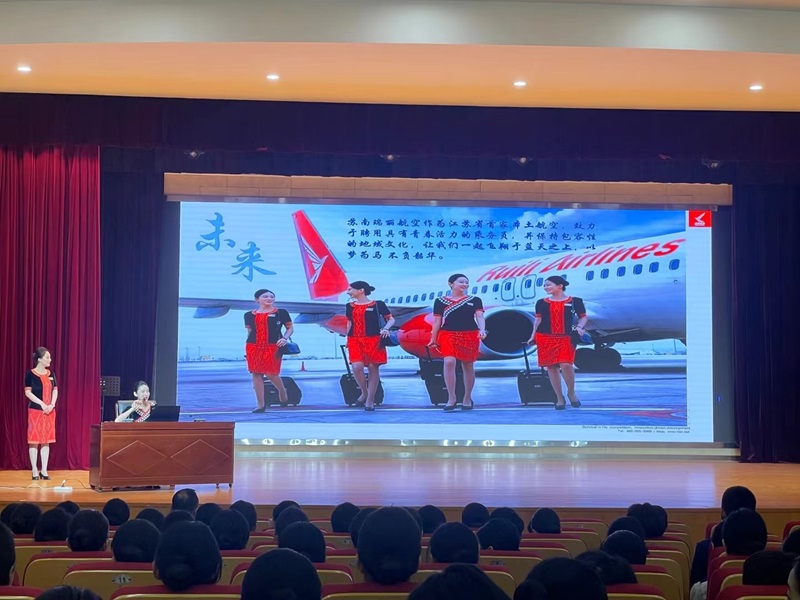 宣讲会上,客舱部总经理刘树成就与学校合作开设的苏南瑞丽航空订单班进行了讲解,并为同学们针对面试、培训、晋升空间等问题进行答疑。苏南瑞丽航空乘务长向同学们详细介绍了公司的发展历程、企业文化、战略布局、工作环境、薪资待遇等方面情况。通过生动的案例和详实的数据,展现了苏南瑞丽航空作为国有企业的机制体系和对人才的重视。通过交流互动,同学们对就业少了一份忧心,多了一份信心,实现了与企业的“双向奔赴”。