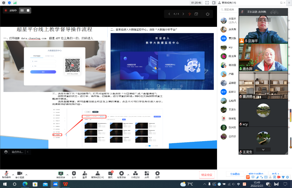2 月23日下午,学校召开2021-2022学年第二学期第一次教学督导工作例会,会议通过超星平台腾讯会议形式在线召开。17名校级督导员和发展规划处(质量管理办公室)全体人员参加会议,会议由发展规划处处长唐永刚主持。