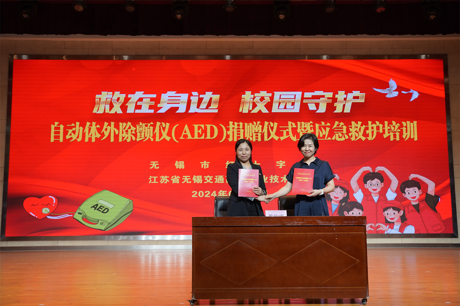 6月12日下午,“救在身边,校园守护”自动体外除颤仪(AED)捐赠仪式暨应急救护培训在学校大礼堂举行。无锡市红十字会党组成员、副会长周彬,无锡市红十字会赈济救护部部长宋扬,学校党委书记、校长李进出席活动。仪式由校党委委员、副校长吴雪琴主持。