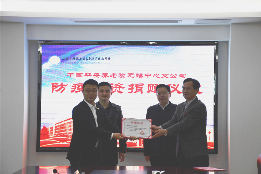 4月23日,学校举行防疫物资捐赠仪式。会上,中国平安养老险无锡中心支公司为学校捐赠10000只口罩,无锡市教育局高职处副处长蔡锦山、中国平安养老险无锡中心支公司党支部书记谢琨、MILAN.COM党委书记李虎出席会议。