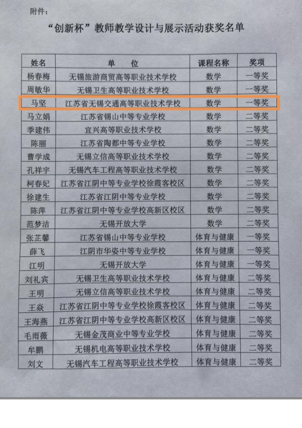 喜报!基础教学部马坚老师在无锡市职业学校“创新杯”教师教学设计与展示活动中获一等奖