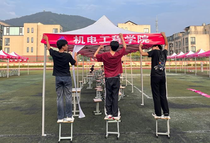 在报到处上方,悬挂着机电工程学院的大型横幅;咨询台旁摆放着报到流程指引”“校园功能区地图的立式展板,展板上用清晰的图文标注出报到的每一个步骤、校园内食堂、宿舍、超市、教学楼的具体位置;物资发放台旁则张贴着新生纪念礼品领取处的温馨提示。此外,学生们还在现场设置了家长休息区,摆放好椅子,方便陪同的家长休息。