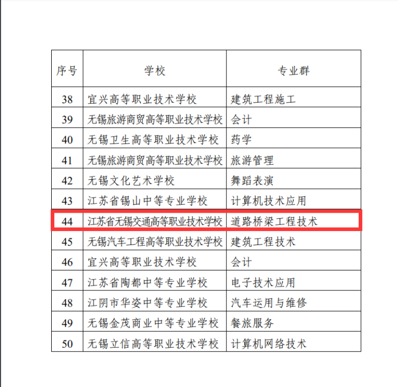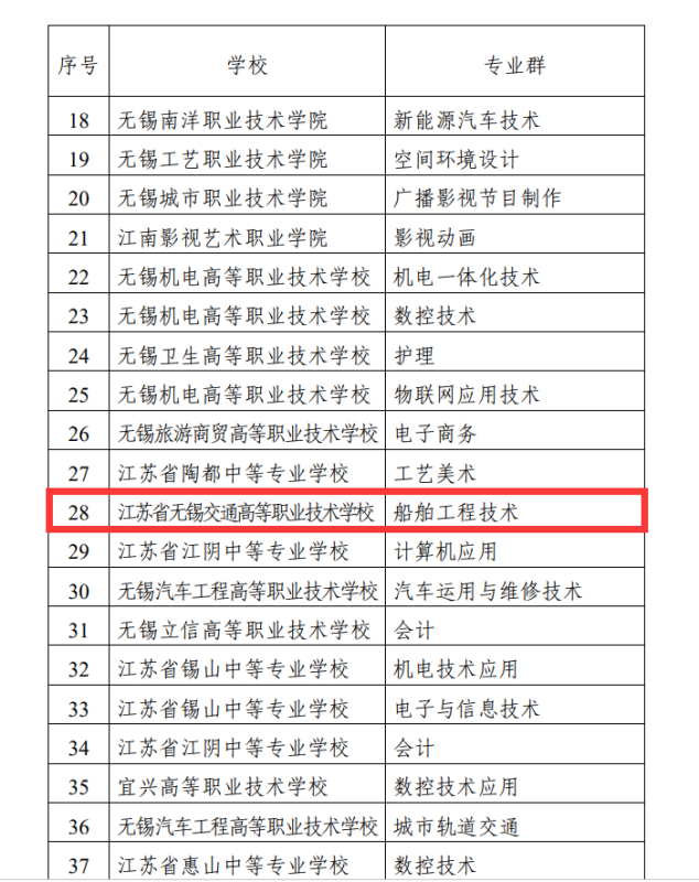 近日,无锡市教育局发布锡教高职函〔2020〕8号文件《关于公布2020年无锡市职业教育现代化专业群的名单》,我校船舶工程技术专业群、道路桥梁工程技术专业群入选2020年无锡市职业教育现代化专业群。