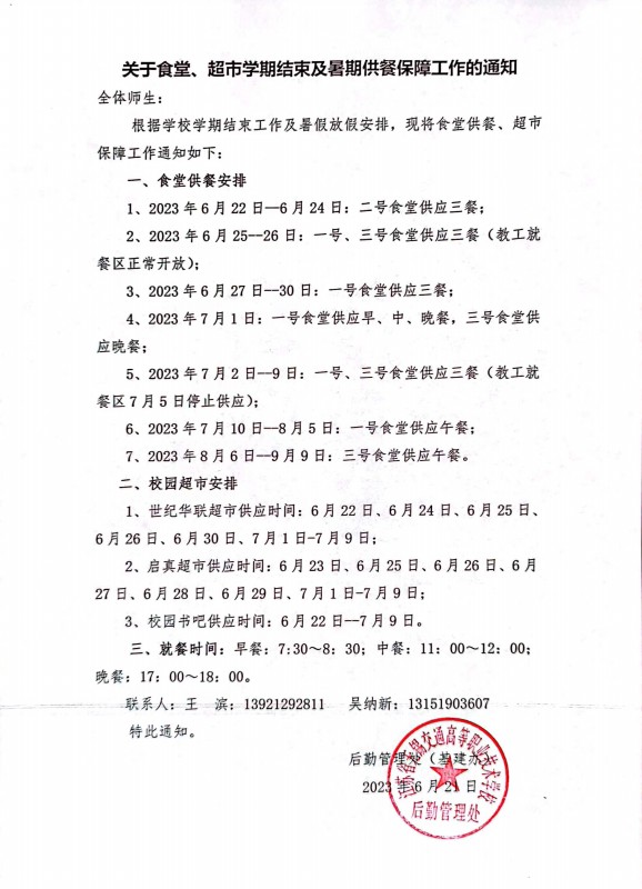 食堂、超市学期结束及暑期供餐保障工作的安排