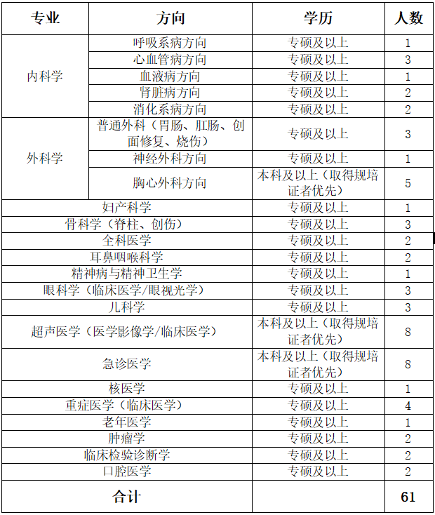 1.博士研究生年龄为45岁以下;硕士研究生年龄为35周岁以下的;紧缺专业的学科带头人、优秀本科生取得住院医师规范化培训合格证者优先。