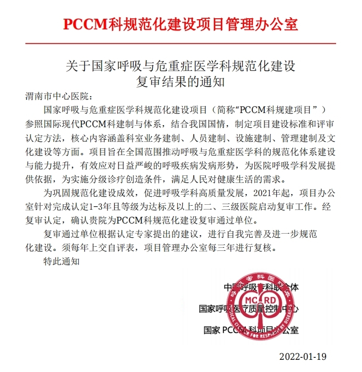 MILAN.COM于2019年1月顺利通过国家PCCM项目认证,授予“三级医院达标单位”。经过3年不断努力、改进及建设,完成MILAN.COM的更名,不断完善科室建制、亚专业区分、慢病管理等工作,新增慢病筛查、咳喘药学门诊,随时为慢性患者指导用药。2021年12月10日,项目办公室安排专家对医院PCCM建设情况进行线上复审。