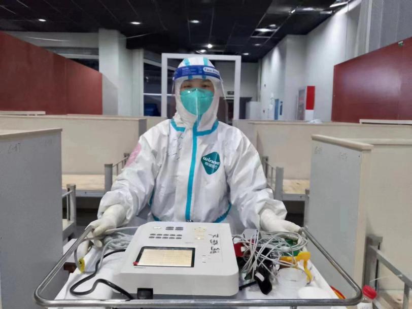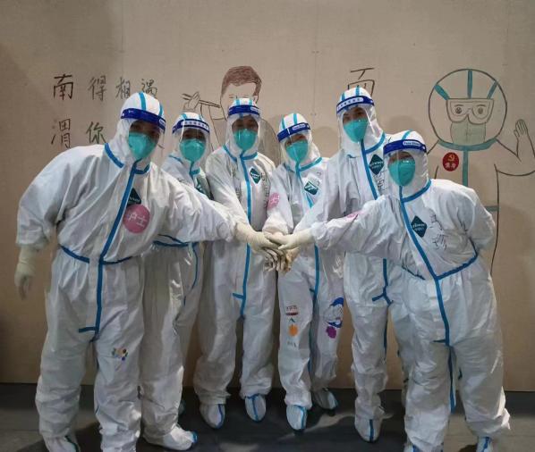 高效,我们通力合作。由于时间紧,任务重,4月16我们医疗队在控感科吴燕老师及李遥护士长的部署下便开始了紧张有序的培训。为了保证每一位队员安全,必须经过严格的考核,合格后才可上岗。4月17日我们接管的清零方仓医院开始收治病人,我也开始投入到工作中。第一次进舱,心中还是有些紧张与不安,组长杨丹凤便看出了我的不安,耐心与我沟通,解除了我的顾虑。我们相互协作,从接诊到处理医嘱,书写病例、测血压、血糖等工作有条不紊进行着,并在控感老师的指导下规范脱下防护用品,顺利出舱。