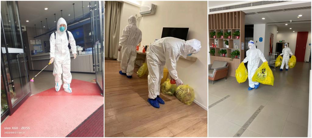 按照闭环酒店感染控制要求,党政办曹胜利、外联办罗渭峰、科研教学科何博武、内镜中心崔盾24小时轮流值班,依据工作流程配制消毒液,规范穿脱防护服,肩背30斤重的消杀桶,从酒店一楼大厅至4楼对办公区地面、酒店走廊、电梯间、医废处置间等每日三次进行全面消杀。严格执行闭环酒店医疗废物交接及登记制度,指定专人负责医疗废物存放区管理工作。每天早晨核酸采样完毕时,当班2名工作人员规范穿着防护服对医疗废物进行规范包扎、准确计重及注明标签等,与医疗废物处置公司双方现场办理交接手续,完毕后对医疗废物存放区、过道及交接区进行全面消杀,累计完成交接医疗废物约2900千克。经常在消杀及医疗废物处理结束时,大家防护服内衣服已经被汗水浸透。