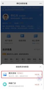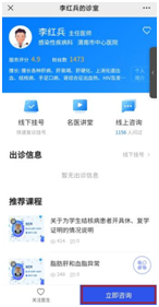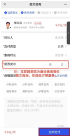 三、选择医生后点击【立即咨询】——【图文咨询】,填写就诊人相关信息并尽可能详细描述您的症状,输入无误后,点击【立即支付】,支付完成后微信公众号会收到【医院通知】,等待医生接诊后即可进行在线交流。