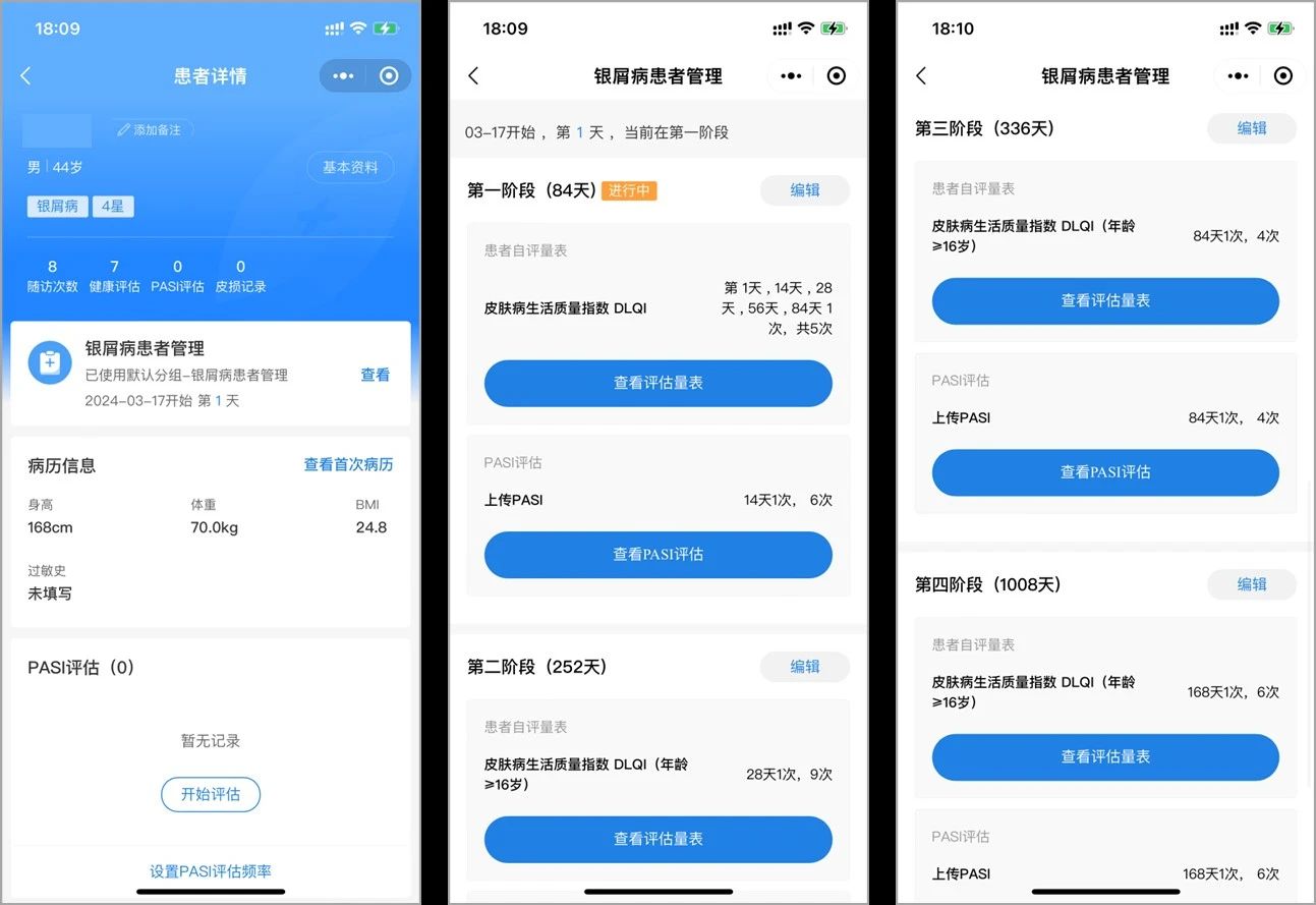 医院基于项目统一标准,通过睿肤病程管理平台有效管理银屑病患者百余人。在实现项目数据高效采集的同时,实现患者院内院外的一体化治疗和管理,建立了患者与科室间长期、高效的互动,全方位提升患者就医体验。