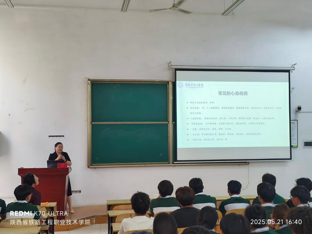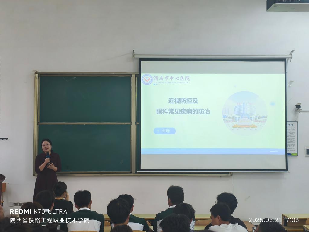 5月21日下午,医院精神心理科与眼科专家团队走进陕西省铁路职业技术学院。精神心理科心理咨询师张艳以《青少年心理状态与心身健康》为题,通过临床案例解析常见心理困扰,演示“情绪温度计”自评法,强调长期焦虑可能诱发心身疾病;眼科主任田瑾以青少年近视防控的措施为切入点,为同学们讲解了高度近视的危害、高血压、糖尿病等会引起的眼部损害,最后着重提出了心理状态可能导致的眼病-干眼症,使得同学们明白眼睛重要性的同时也能够了解到如何去爱眼护眼,对抗眼部疾病,加深了同学们对于近视以及眼科常见病的认识。