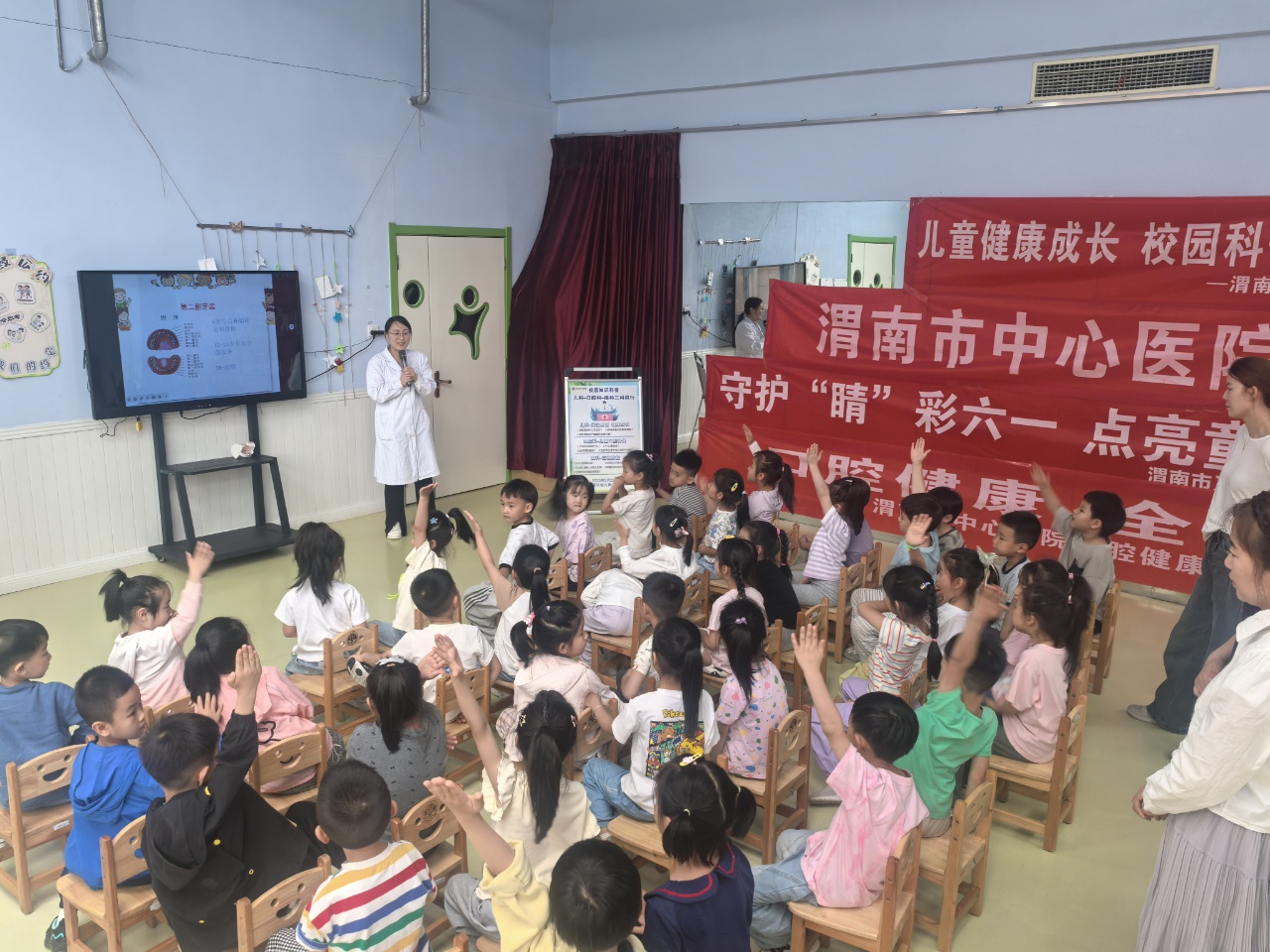 5月22日上午,医院儿科、口腔科、眼科组成的团队走进爱乐幼儿园,为学龄前儿童带来“沉浸式”健康课堂,通过互动游戏等方式开展趣味科普,并为幼儿建立《视觉发育档案》,赠送“健康大礼包”。