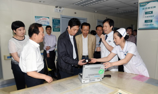 随后,调研组来到我市重点学科——心血管内科,清洁温馨的就医环境,富有朝气、尽职尽责的医护人员,西北首家远程心电监护系统,给戴主任一行留下了深刻的印象。我院心内科主任李军农为调研组进行了学科建设方面的介绍。李主任用PPT的形式回顾了由心血管内科承担的国家“十二五”重大项目——H型高血压比较效果研究项目,以及在区域项目合作、科研推进等方面的工作进展和取得的成绩,并向调研组介绍了属于渭南地区的卒中防控“渭南模式”以及学科发展的远景规划,得到了调研组的高度肯定。