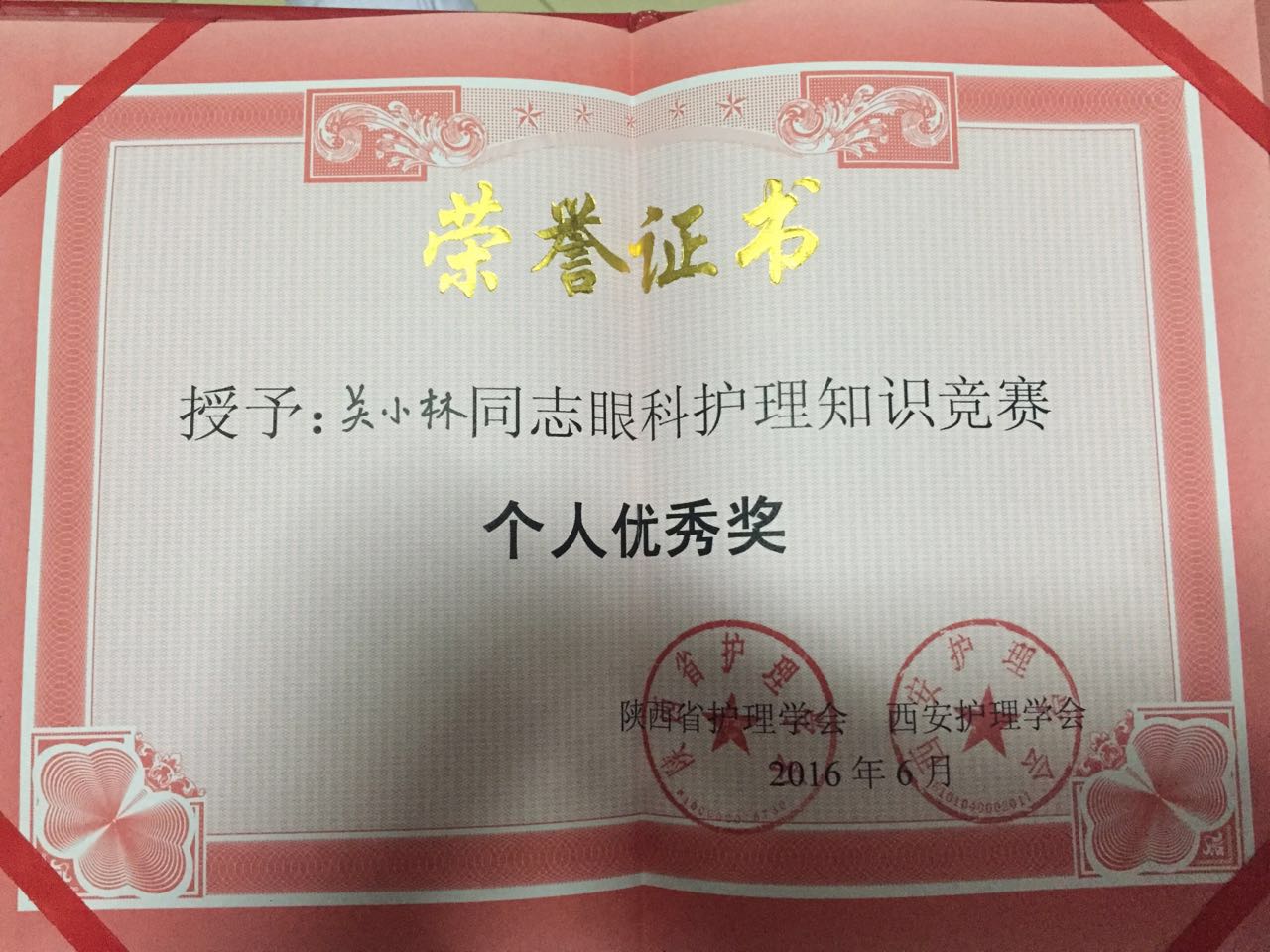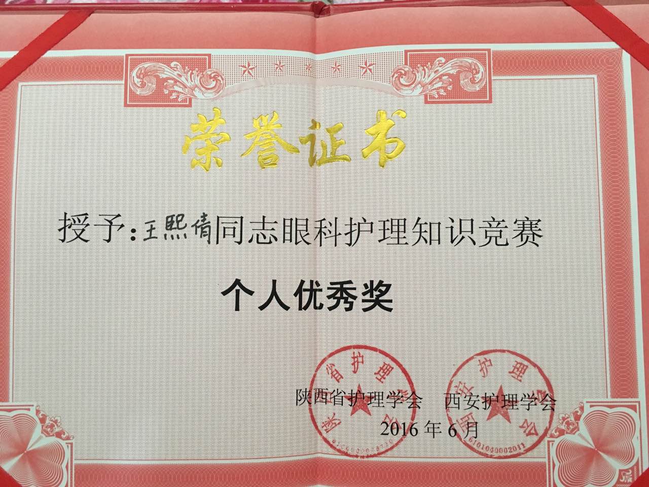 为夯实基础护理、提高眼科护士专科理论水平,激发护理人员学习的热情,6月3日由陕西省护理学会、西安护理学会眼科专业委员会主办的护理知识竞赛活动在西安举行。我院眼科响应号召、积极参与,在自愿报名的基础上选派李萍、关小琳、王熙倩三名骨干护士参加了本次竞赛。经过笔试、抢答等环节,李萍获得个人三等奖,关小琳、王熙倩获得个人优秀奖。