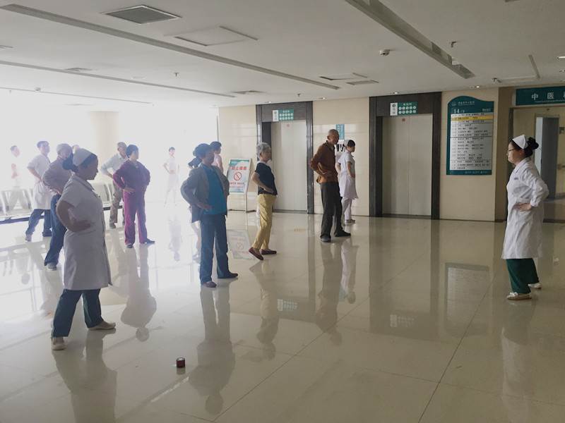 每日清晨准时八点,科室的患者及医护人员都会不约而同地聚集到住院部十四楼电梯口,由主管护师许婷婷带领大家练习“八段锦健身操”,这已经成为他们共同的习惯。由于中医科患者大多数属于老龄化患者,每日练习前由一名责任护士带领锻炼,两名责任护士和一名大夫在周围负责保护患者的安全,每次10分钟。由在场的医护人员收集每天锻炼结果,锻炼者的自身感受,以及每个动作掌握的难易程度,对收集的结果进行分析。并结合患者实际,对体操动作、锻炼时间, 参加的人员做出适当的调整,制定出更加适合患者锻炼的“八段锦体操”,使其能惠及更多的患者和家属。