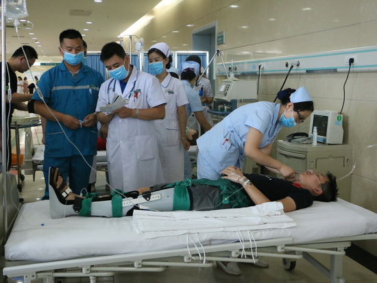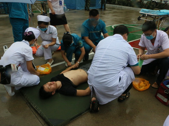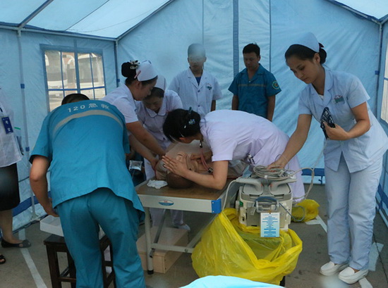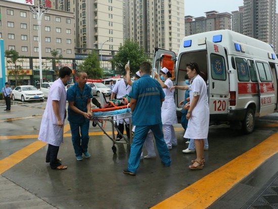 天空下着沥沥细雨,此次演练模拟场景为开发区武警支队施工现场发生楼房倒塌,有20余人不同程度受伤,请求现场救援。演练共分为三个场景,第一场景:急诊科接到武警支队突发灾害请求救援,并立即通知应急领导小组,启动医院应急预案,组织人力、物力赶赴现场救援。在急诊科王永升主任的指挥下,迅速对现场伤员情况进行分类诊治,对重症心肺复苏患者、肠外露患者、颈部损伤、重度颅脑损伤进行现场处理贴红色标志后首批转运。对颅脑外伤、胸部损伤、皮肤软组织损伤等轻伤患者进行现场处理贴黄色标志后第二批转运。最后对死亡人员经检查无生命迹象,贴黑色标志装尸体袋进行最后转运。同时通知分诊台进行院内接诊。第二场景:院内分诊护士立即通知科室值班医护人员做好接诊准备,同时上报科主任、护士长,启动应急预案,急诊科主任立即向院突发事件应急小组报告,通知医院巡逻队保证急救通道畅通,确保秩序安全。院内分诊台接到患者后立即送往急诊抢救室进行进一步生命抢救。第三场景:由相关医护人员负责对重度心肺复苏患者、肠外露、颈部损伤、颅脑损伤患者进行转运至手术室进行进一步生命抢救。演练细致而又紧密,圆满结束。