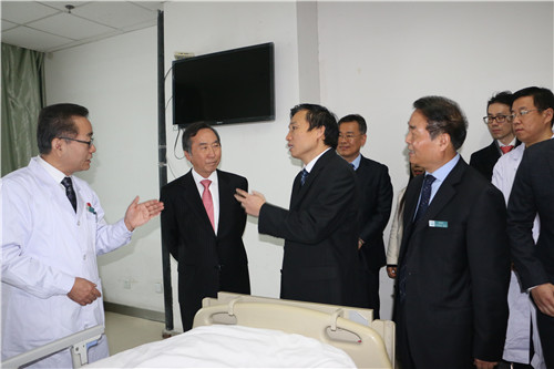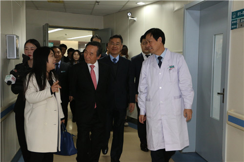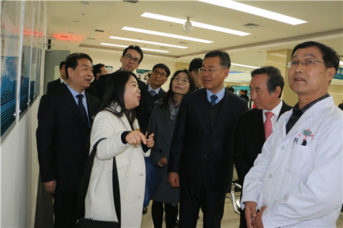 参观完门诊楼,代表团来到了住院楼,在神经外科二病区的病房内,代表团见到了两位患者。白西民主任介绍了患者住院前病情,用MRI、CT片演示了患者的病情状态,讲述了治疗方法,术后患者恢复良好。在代表团出病房的时候,有位患者亲切地说了一句:“中韩友好”,表达了所有在场人的心愿;最后,在心内科的示教室,心内科李军农主任将科室的业务范围以及研究课题为代表团做了详细介绍。