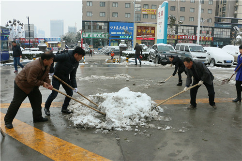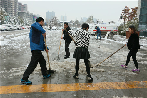 院领导身先士卒,掀铲扫雪,职能科室的工作人员有的用扫帚、有的用铁掀。大家同心协力,先铲起坚硬的雪块,把雪块拢成一堆,再用扫帚扫净残留在路面的冰屑,铲、推、扫,场面热火朝天。经过两个多小时的奋战,在大家团结协作下,院区车道上的积雪打扫得干干净净。