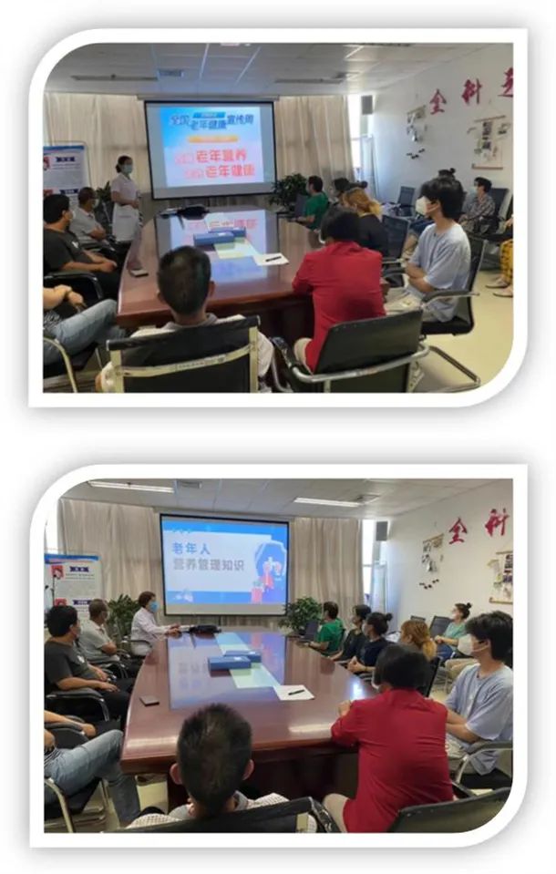 7月29日,在老年病、血液病科示教室,由护士长陶燕燕主持,营养师石小娅对住院老年患者及家属进行老年营养知识宣讲,现场播放国家卫生健康委老龄健康司制作的科普视频,耐心解答老年人健康问题。