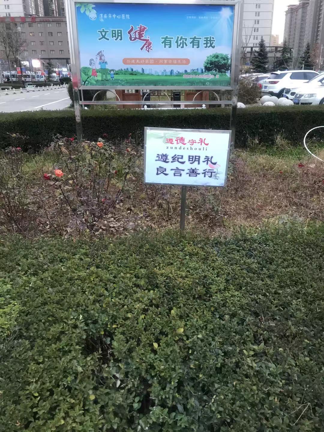 为配合全市创建国家文明城市活动,医院在非机动车辆管理、文明标识设置方面下足功夫。在医院南门、北门、急诊、职工通道外路段划设非机动车辆停放标识线、非机动车辆指示牌、安装垃圾桶,在院内划设无障碍车位标识牌、地标,引导市民规范行为。同时,为加强创文宣教,对包联路段大型公益广告宣传牌全部进行更换,更换院内所有绿化带创文指示牌,倡导群众“讲文明,树新风”。