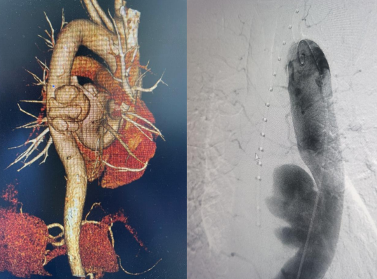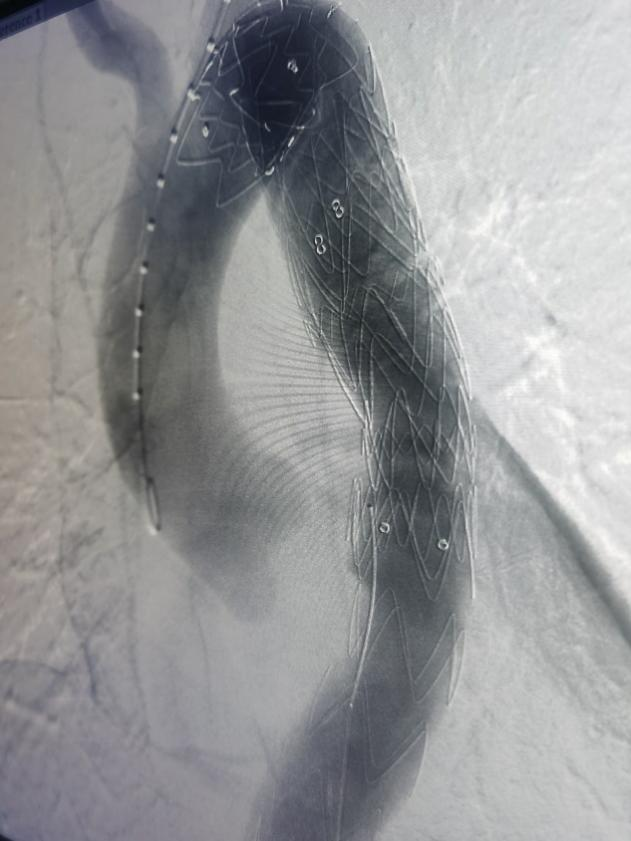 经过胸心外科、介入科、麻醉手术室、超声科多学科协作,于11月4日下午4点在急诊局麻下行胸主动脉覆膜支架夹腔内隔绝术,术中精准释放覆膜支架,复查血管造影显示,封闭主动脉破裂口,无内漏,支架位置良好,术区相关动脉血管显影良好,“不定时炸弹”成功拆除。术后给予患者抗板、止痛、控制血压等相应治疗,患者目前恢复良好,已顺利出院。该手术的成功,充分体现了我院多学科积极协作的团队精神。
