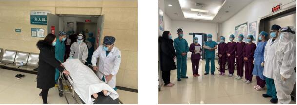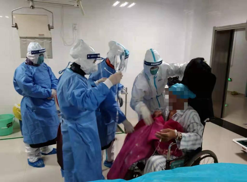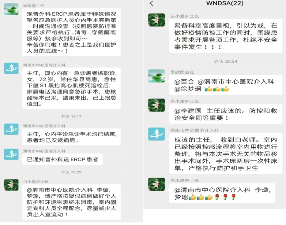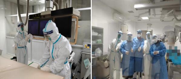 晚7时,介入科应急值班人员李璐、徐梦瑶,在科主任、护士长的协调指导下,全程做好严密防控消杀,在多学科共同配合下手术顺利完成,患者得到安全救治。