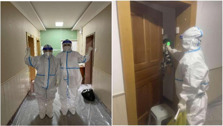 医疗组任务是负责隔离点的医疗工作,包括隔离人员的信息核查、核酸采集、症状和体温监测及上报,健康教育和指导工作人员个人防护等。每天的工作虽然琐碎,但大家都配合默契,严格遵守防护要求,互相监督,互相鼓励。每天早上两人一组,用手机扫码,进行口咽和鼻咽的核酸采集、测体温、询问症状、人文关怀,做好登记。进去一次手里要拿很多东西,很不方便,于是我们废物利用,用捆绑箱子的绳子,放采集的6个盒子,自己制作了一个个“时尚小挎包”,解放了我们的双手。除此之外,我们3名医生每天要网上填报隔离人员体温和核酸结果,另外还担任医疗工作。如果接到哪位隔离人员有不舒服情况,就随时穿上隔离服进去查看,给予诊治及健康指导。