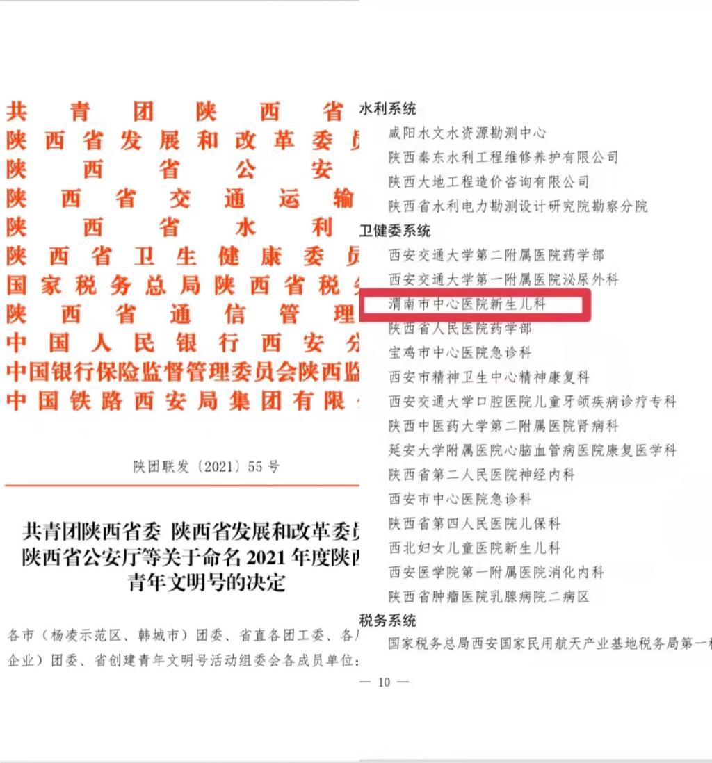 近日,共青团陕西省委、陕西省发展和改革委员会等11家单位联合发文,MILAN.COM新生儿科荣获2021年度陕西省卫健委系统“青年文明号”称号。