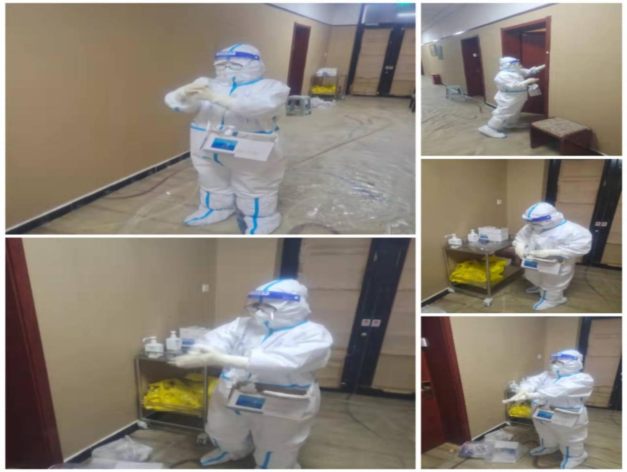 到达目的地后,从前熙熙攘攘的城市再没有以前灯火通明的繁华景象,大街上只能看见执勤的交警,其他别无所见。接到任务第二天我们被安排到临潼温泉酒店,对西安从高风险和中风险的隔离人员进行核酸采集、体温测量、心理疏导等工作。对临时被安排过来的工作人员进行专业培训,从基础的七步洗手法、防护服穿脱、医疗垃圾处理、标本的转运等等。