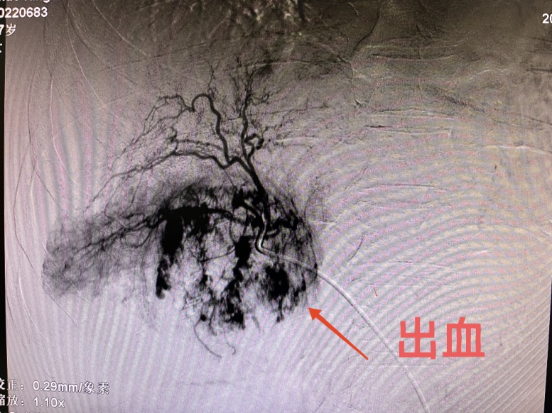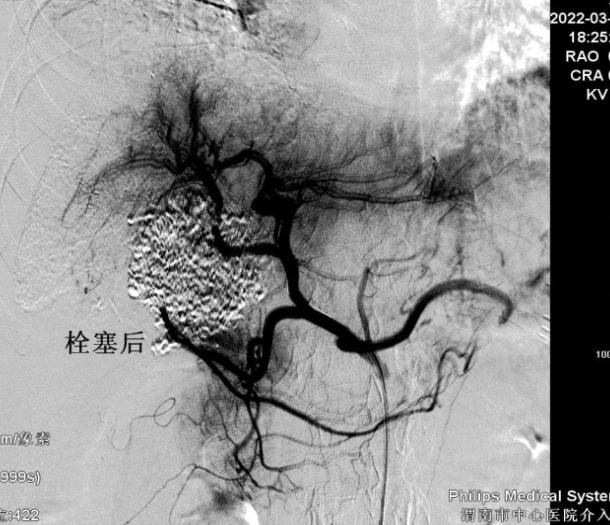 该患者诊断及时,采取介入治疗迅速有效,避免了外科开腹手术,减少了创伤。