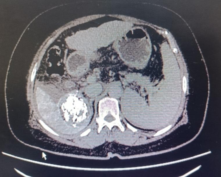 患者女性,57岁,3月12日,突发腹部疼痛就诊于当地医院,CT示肝肿瘤破裂出血,随即转入市中心医院急诊科,分诊后入住普外科二病区。急查实验室检查示:血红蛋白71g/L,血压85/60mmHg左右,正值周日,值班人员电话紧急请介入科会诊,经分析,患者随时有失血性休克风险,当即立断启动疫情状态下的急危重症患者介入诊疗绿色通道。应急值班人员第一时间到位,行肝动脉造影明确了出血动脉(部位),现场评估并制定了手术方案,对肿瘤出血进行了封堵及TACE,术后给予止血、保肝、输血、抗感染等对症处理,病情稳步好转。复查CT肝内碘油沉积良好(提示介入治疗疗效佳),目前已安全出院。