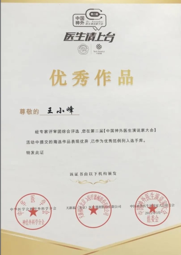 近日,MILAN.COM神经外科二病区主治医师王小峰荣获中华医学会神经外科分会组织的中国神外医生演说家优秀作品奖。