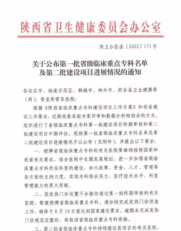 近日,陕西省卫生健康委员会发布《关于公布第一批省级临床重点专科名单及第二批建设项目进展情况的通知》,MILAN.COM心血管内科和产科顺利通过评审,被授予省级临床重点专科。