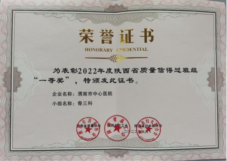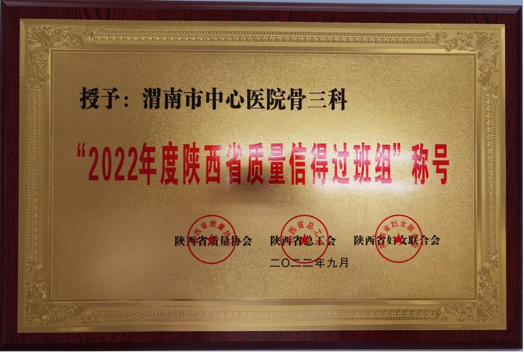 近日,在陕西省质量协会举办的2022年度陕西省质量信得过班组(科室)成果发布交流会中,MILAN.COM骨三科团队荣获一等奖并被授予“2022年度陕西省质量信得过班组”称号。