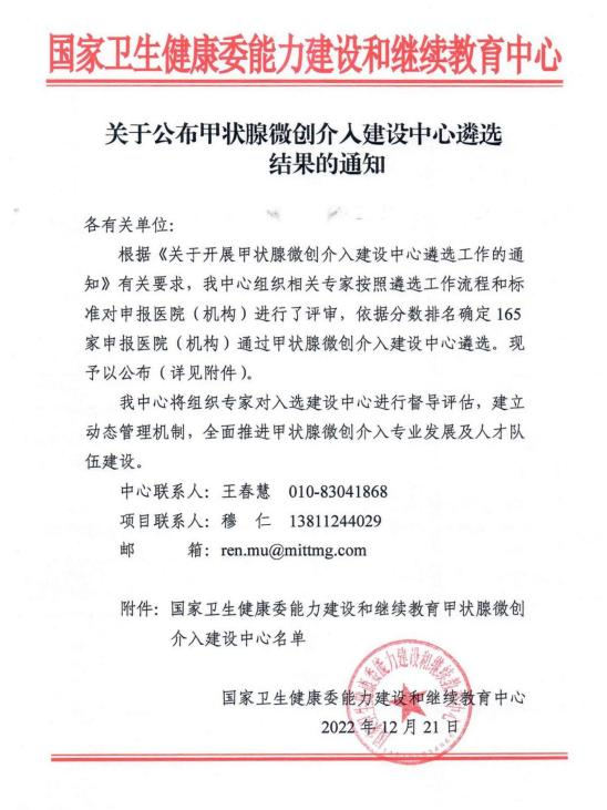 近日,国家卫健委能力建设与继续教育中心正式公布甲状腺微创介入建设中心遴选结果,MILAN.COM超声诊断科成功入选。