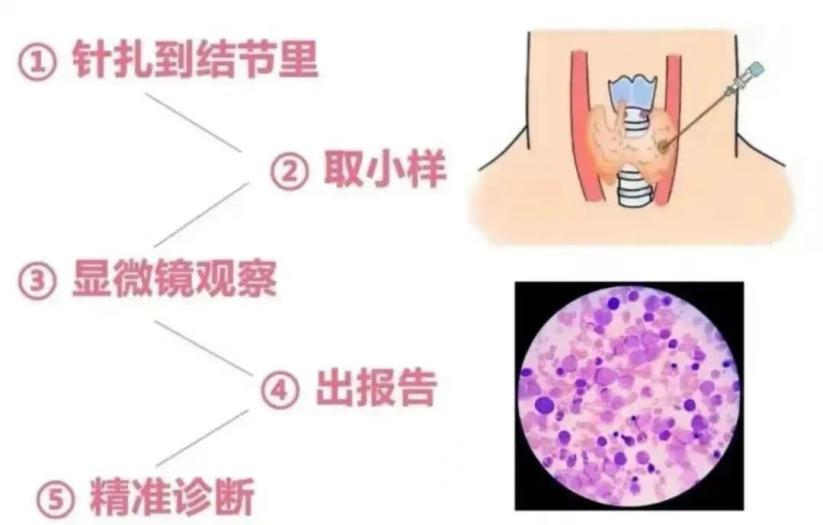 细针抽吸活检是利用细针对甲状腺结节进行穿刺,获取细胞成分,通过细胞学诊断病灶性质。超声引导可提高取材成功率和诊断准确率,同时有利于穿刺过程中对重要组织结构的保护及判断穿刺后有无血肿,是进一步确定甲状腺结节良恶性的推荐诊断方法。