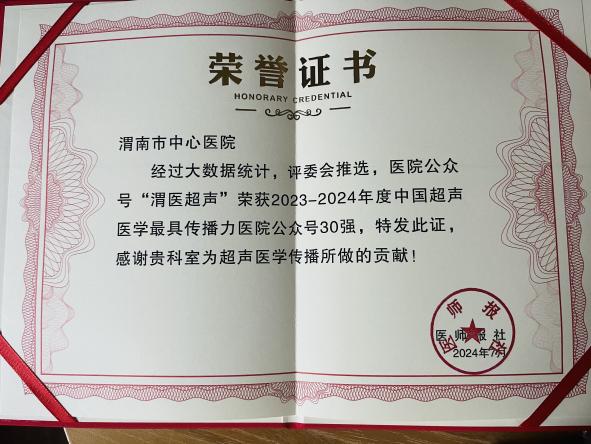 近日,由中国医师协会唯一官方媒体《医师报社》主办,南京医科大学附属苏州市立医院承办的2024中国超声医学传播者年会上,市中心医院超声医学科公众号“渭医超声”获评中国医院最具传播力医院公众号30强,是陕西省唯一获此殊荣单位。