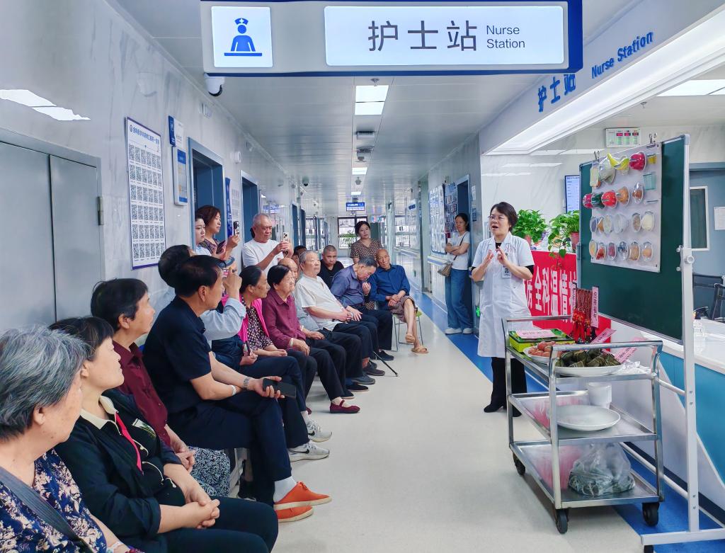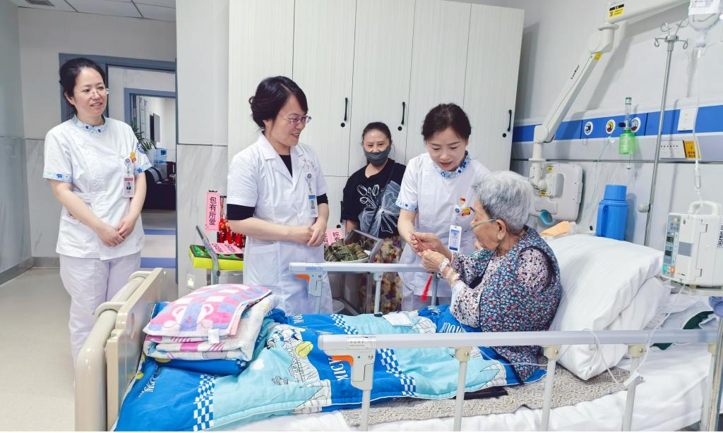 科普环节后,由医护人员组成的“爱心小队”推着满载节日心意的餐车穿梭于各病房。象征安康的红枣粽、绿豆糕、五彩蛋整齐陈列,手工缝制的五色绳香包散发着艾草清香。“祝您端午安康,早日康复!” 刘燕主任将温热的粽子递到患者手中,杨阳护士长为老年患者细心系上祈福五色绳。78岁的张爷爷握着医护人员的手感动不已:“住院也能收到这么贴心的节日礼物,让我们感受到家的温暖。”