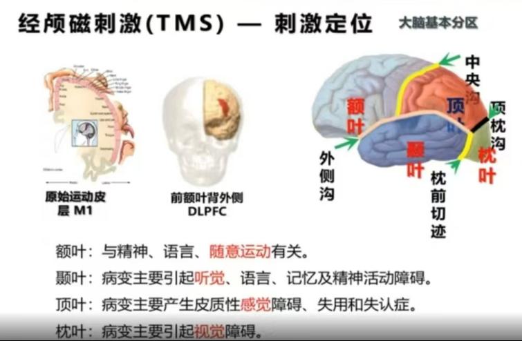 大脑分额叶区、顶叶区、枕叶区、颞叶区和小脑,每个部位都有不同的功能,不同的脑部疾病对应着不同的病变部位。经颅磁刺激治疗的部位通常为:左、右额叶背外侧、M1区、Broca区、颞顶叶、视觉功能区等,具体根据患者的临床表现和症状选择。