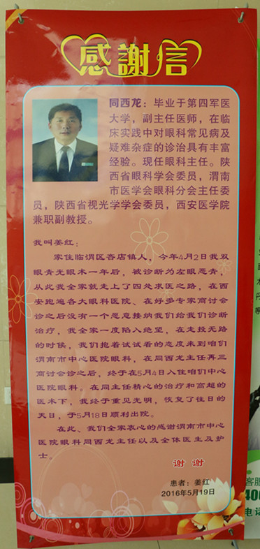 “今年4月2日,我双眼青光眼术一年后,被诊断为左眼恶性青光眼,从此我们全家就走上了四处求医之路,在西安跑遍各大眼科医院、在好多专家商讨会诊之后没有一个愿意接纳我们给我们诊断治疗,我们全家一度陷入绝望,在走投无路的时候,我们抱着试试看的态度来到咱们中心医院眼科……”近日,一名患者在感谢信中这样写道。