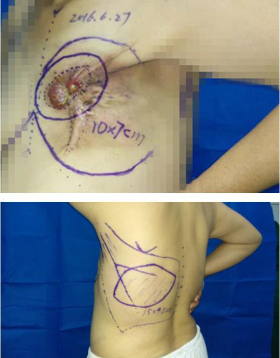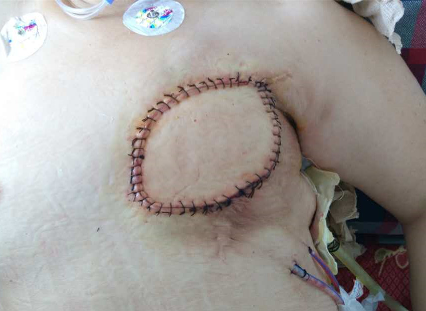 据主管医生张永辉主治医师介绍:这位患者8年前在外院确诊乳腺癌,并实施了乳腺癌根治术。但两年后胸壁就出现了复发,复发后先后进行了16次化疗、5年的内分泌治疗,并在10月前进行了胸壁的放射治疗。不幸的是近2月,胸壁肿瘤再次复发,并逐渐出现溃烂出血,患者入院时感叹:“这6年,疾病使她及家人经历了躯体和精神上的双重打击,折腾的够呛!”。患者入院后经全面检查,CT确诊胸壁肿瘤侵犯到“皮肤、皮下组织、肌肉、肋骨、壁层胸膜下组织”全层胸壁,但除胸壁外未见明确远处转移。