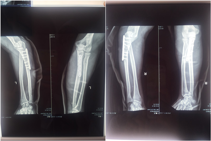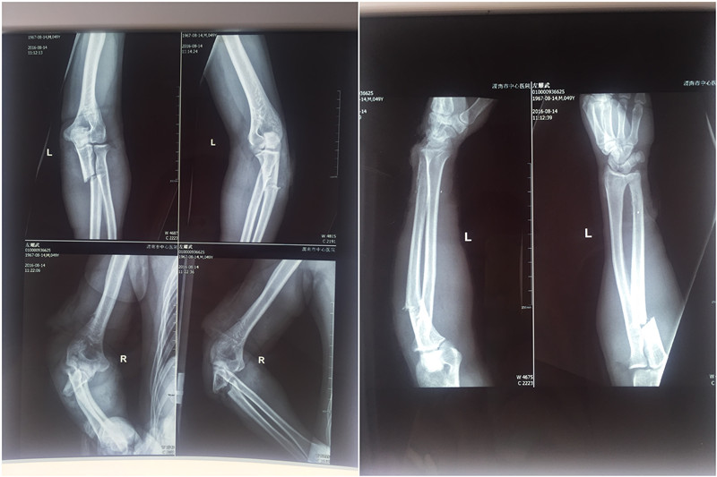 近日,一名中年男子左先生遭遇意外,被数人用刀砍伤双上肢及左下肢,立即被120送往我院急诊科,骨一科接到急诊科会诊电话后迅速对左先生进行紧急抢救。经过快速输液、拍片等检查,随即转往骨一科进一步治疗。初步诊断为:双侧尺骨多处开放性骨折、桡骨开放性骨折、右侧肱骨开放性骨折、桡神经丶尺神经、肌皮神经断裂、全身多处肌肉、肌腱断裂。