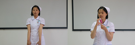 随后,护师给各位患者及陪人演示了哮喘药物吸入装置的用法,并现场指导患者使用。
