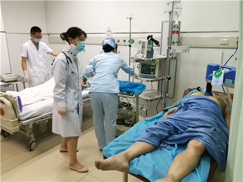 7月20日,急诊抢救室送来了第一位重症中暑的病人,来时已昏迷、高热、大小便失禁,抢救室的医生护士立即为患者开通了绿色通道,气管插管,呼吸机应用,4℃冰盐水静脉滴注,药物降温,头戴冰帽,降温毯......患者情况逐渐好转,神志转清,现患者已经脱离呼吸机,生命体征平稳,转入神经内科进一步治疗。