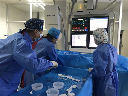 患者全身皮肤金黄瘙痒难忍,在B超定位下行肝内胆管引流术、术后因引流不畅拔管;在胃镜下逆行ERCP胆管支架植入术,经过术者反复操作,但导丝无法通过病变段。看到患者痛苦不堪,家属迫切治疗的场面,介入科李建国主任现场会诊提出为患者在介入下行PTCD治疗的意见。术前经过讨论制定多套严密方案,与患者及家属多方沟通达成介入手术共识;术中精准定位穿刺选择不同的导丝、导管多角度旋转闭塞原地不动,时间一分一分过去......在医护人员努力下,闭塞的胆道开通了,再经球囊分段扩张病变狭窄段,内外引流管放置顺利300余毫升的黑褐色胆汁流出......