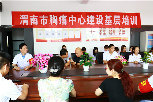 心内科韩红梅副主任给基层医生讲解了胸痛的概念、急性心梗的急救流程、急性胸痛的诊治及转运流程等。告诉大家胸痛必须早诊断早治疗,特别是致命性胸痛。强调了胸痛中心是致命性胸痛患者的绿色通道。
