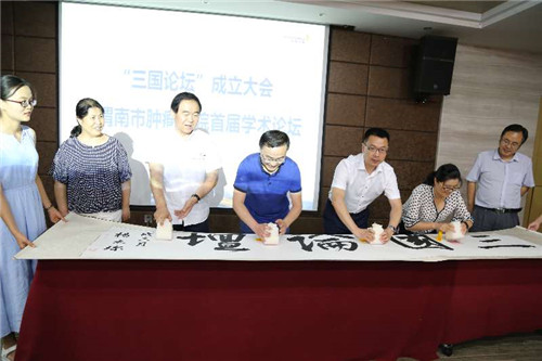 随后,举行"三国论坛"成立仪式典礼,各位专家在横幅上用印章盖上自己的名字。