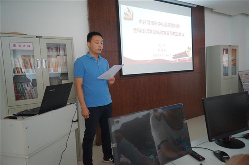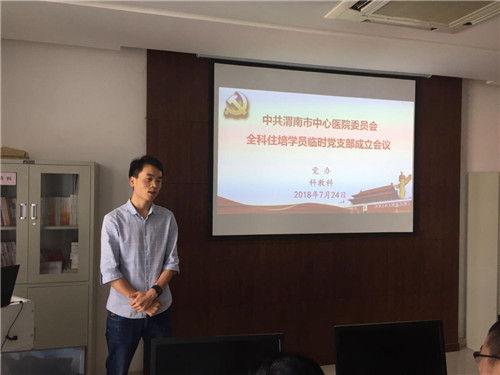 科教科何博武代表科教科全体人员、住培学员党员同志,对一直关心和支持住培工作、住培临时党支部成立工作的医院党委、领导表示衷心的感谢,并宣读了医院《关于成立住培学员临时党支部的通知》文件内容,从住培学员临时党支部组织机构、工作职责、工作制度及相关要求四个方面作了讲解。